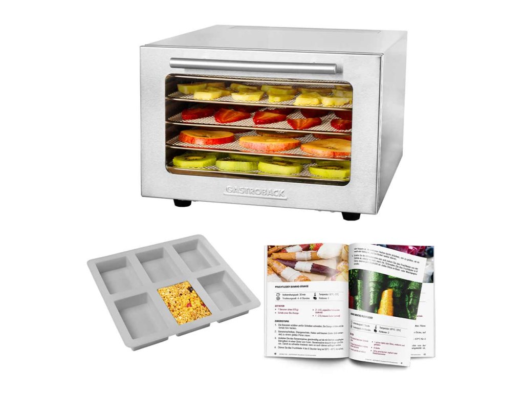 - Včetně rozsáhlé kuchařky (72 stran) na ovocné a zeleninové chipsy, ovocné placky, müsli tyčinky, sladké i slané svačiny, sušené maso (Beef Jerky) a sušené ryby.
