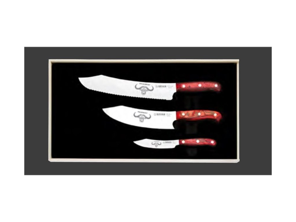 Obsahuje 3 exkluzivní nože německého výrobce GIESSER, řady PREMIUM CUT. Nože jsou v délkách: vlnkové ostří délky 25 cm (1930w/25 rd), hladké ostří délky 20 cm (1900/20 rd) a hladké ostří délky 10 cm (1920/10 rd).