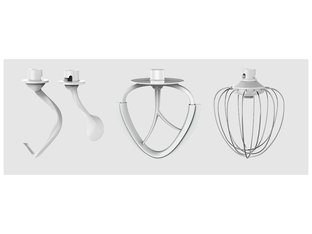 - Rozsáhlé příslušenství: Šlehací metla, hnětací háky, míchací hák se škrabkou.