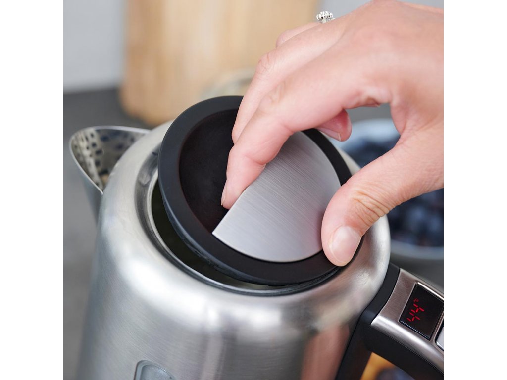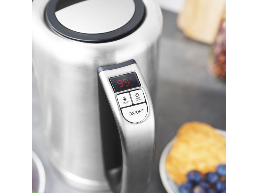 Vybavena je též funkcí automatického udržování teploty po dobu 30 minut s indikací teploty. Nerezová nádoba s objemem 1,7 litrů má praktický ukazatel hladiny vody. Osvětlené ovládací pole a precizní zobrazení teploty vody dodávají konvici moderní nádech.