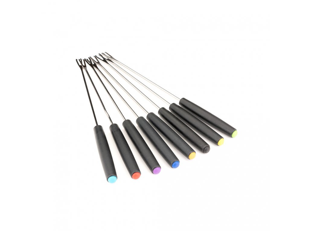 Celý set zahrnuje 8 vidliček z nerezové oceli a otočný talíř s 8 nádobami z nerezové oceli, což umožňuje až osmi lidem současně užívat si fonduový zážitek.