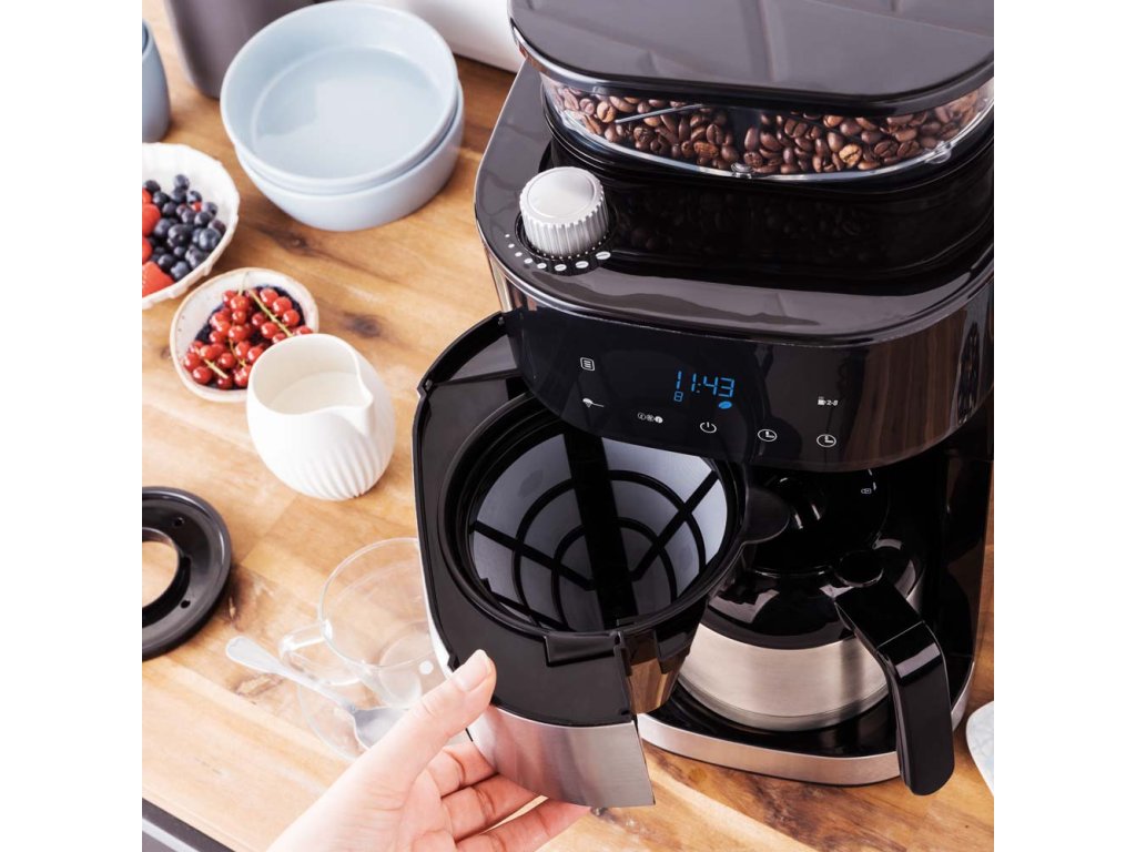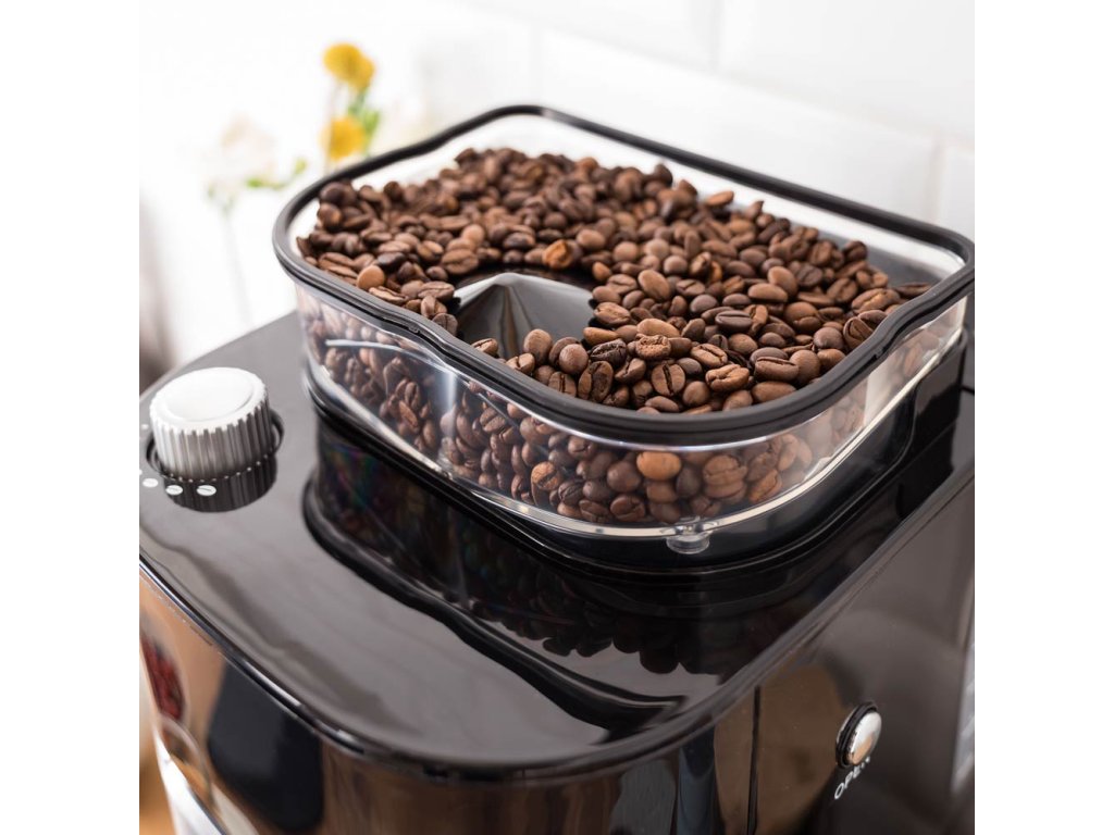 Kávovar je vybaven funkcí pro použití i již namleté kávy, což zvyšuje jeho flexibilitu. Přehledný Soft-Touch LCD displej usnadňuje nastavení a ovládání, zatímco 24hodinový programovatelný časovač umožňuje naplánovat přípravu kávy na požadovaný čas.