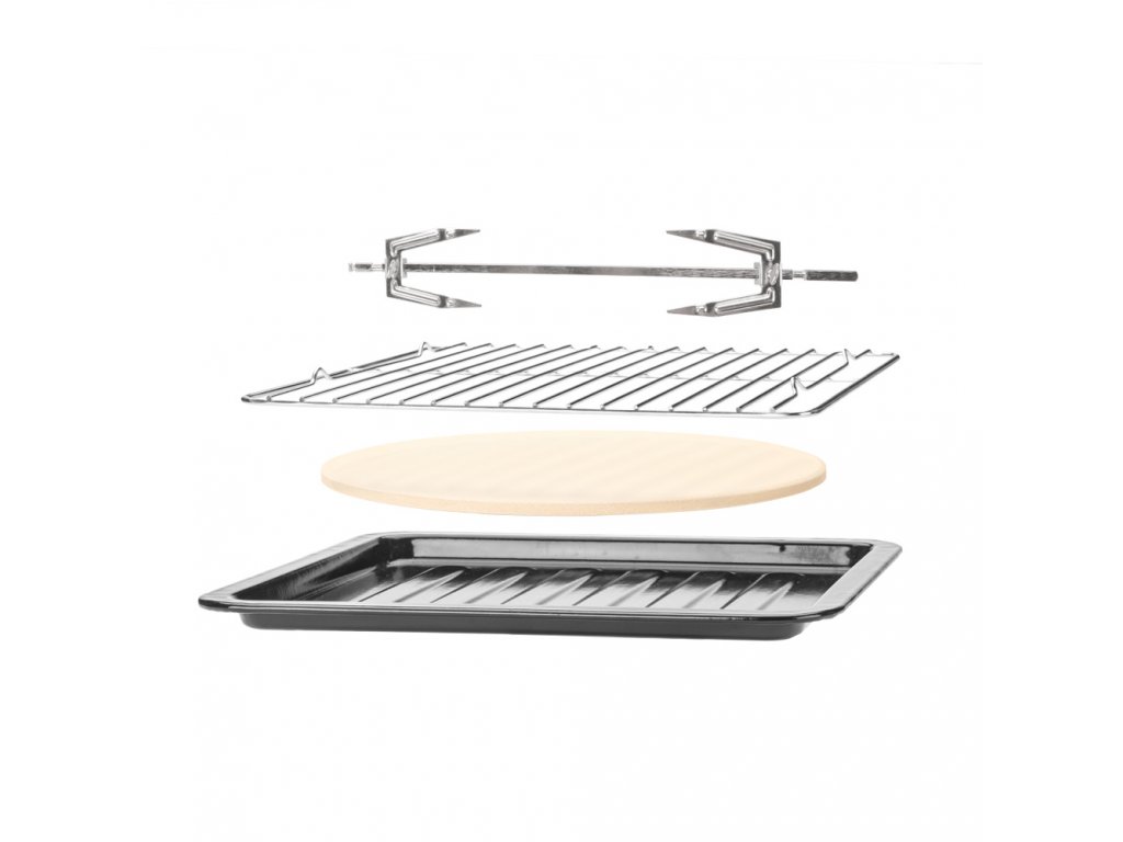 Vnitřek trouby je osvětlen žárovkou 25 W pro snadnou kontrolu vaření. Výbava zahrnuje plech na pečení, gril a kámen na pizzu, což poskytuje široké možnosti při přípravě různých pokrmů.