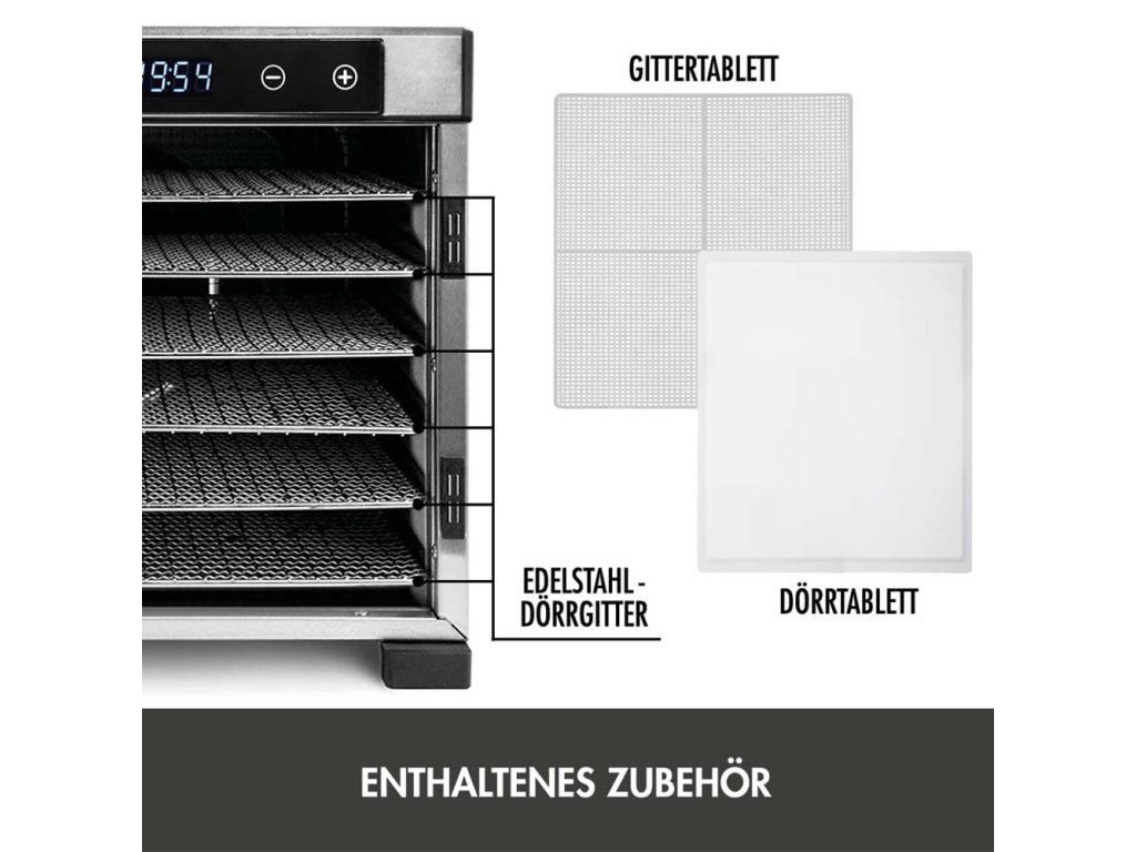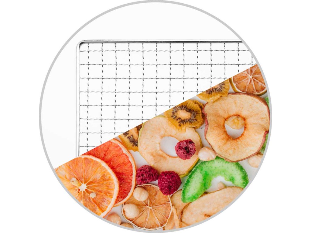 Sušička je vyrobena z odolného nerezového materiálu, a to jak uvnitř, tak vně. To zajišťuje hygienické a snadné čištění. Součástí balení je také 1 sušicí podnos např. pro rozprostření ovocné dužiny pro přípravu ovocné kůry, 1 roštový podnos pro bylinky, bobule nebo květy a 1 forma na müsli tyčinky pro 15 domácích tyčinek.