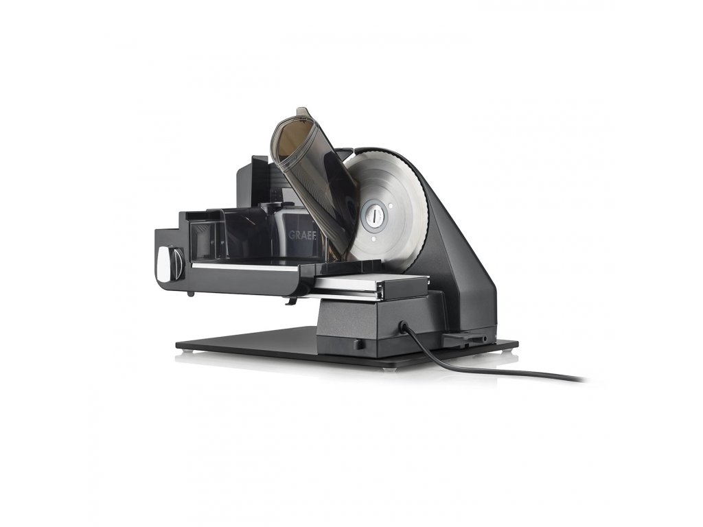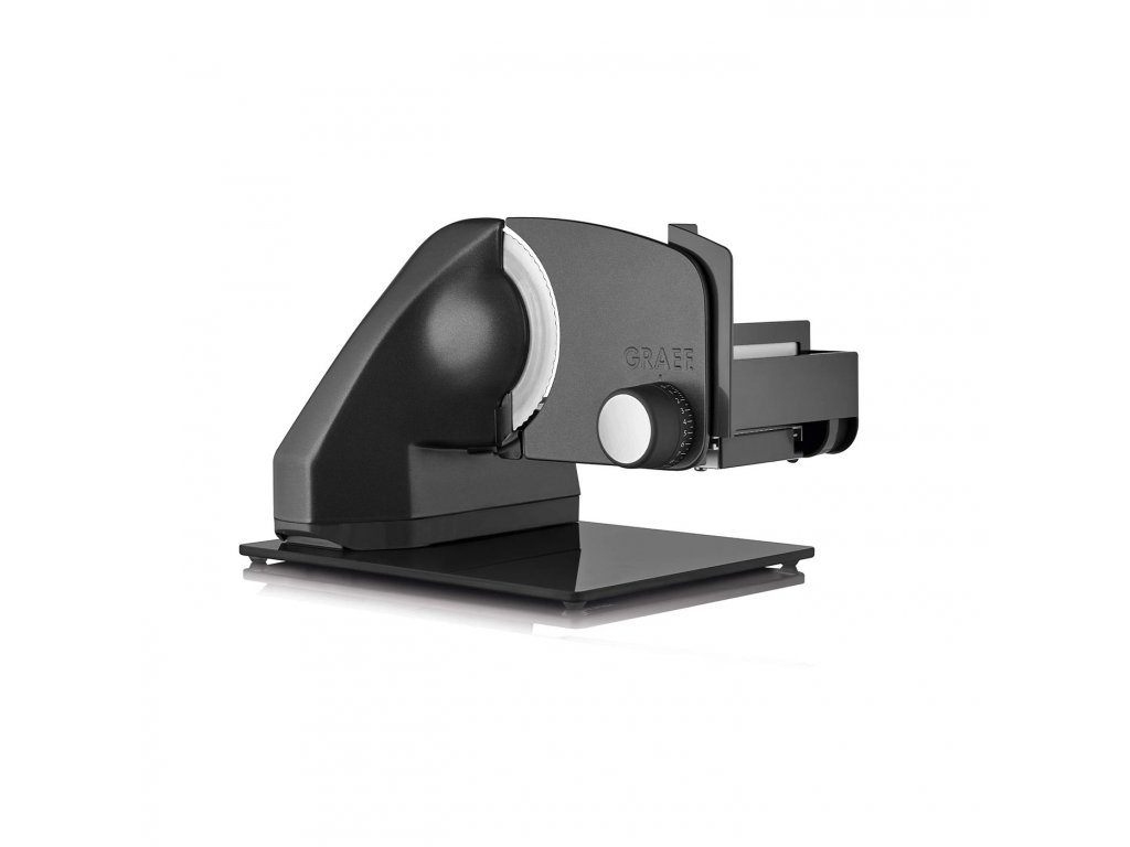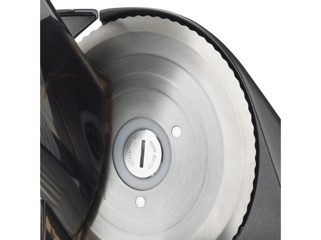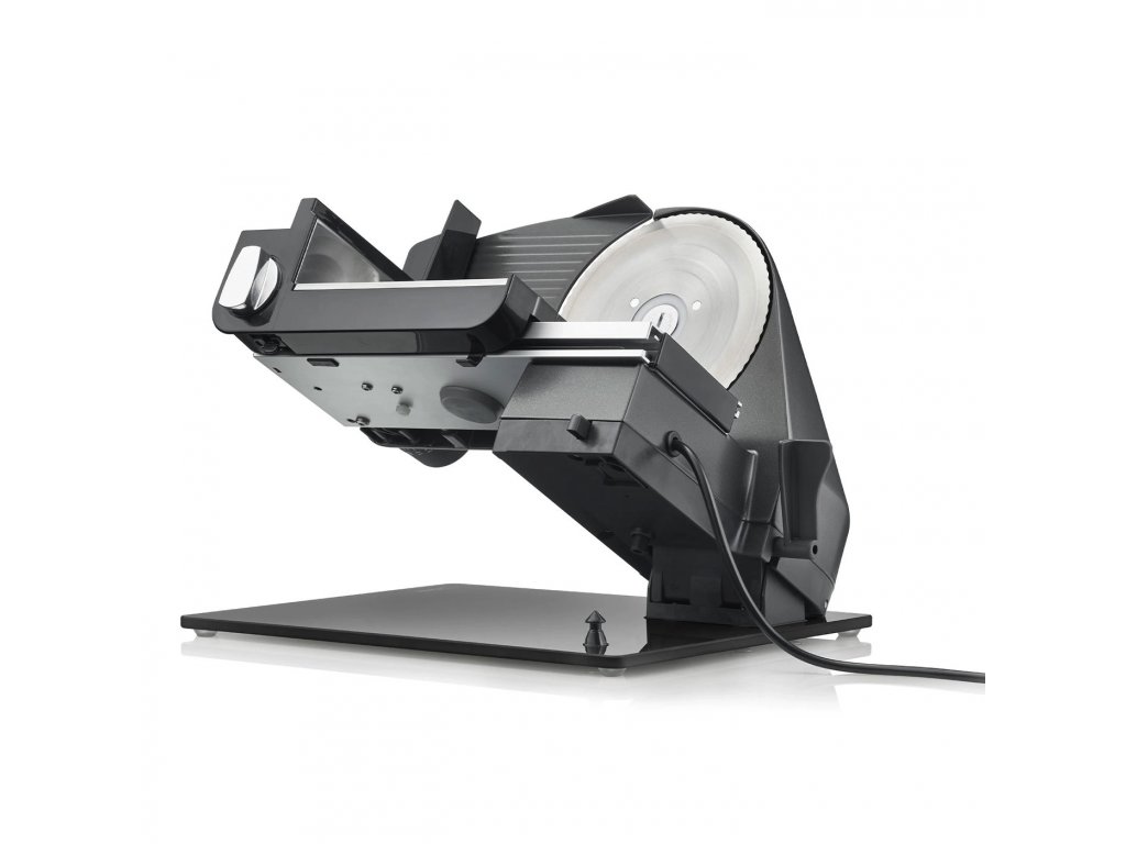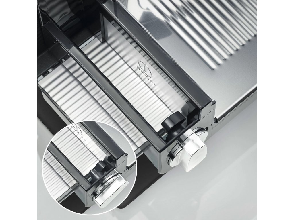 Kráječ má elegantní nadčasový design a extrémně tichý chod. Jeho celokovová konstrukce zaručuje maximální robustnost, stabilitu a dlouhou životnost. Elegantním prvkem je použití tvrzeného skla na základovou desku kráječe. Protiskluzové nožičky zajišťují vysokou stabilitu.