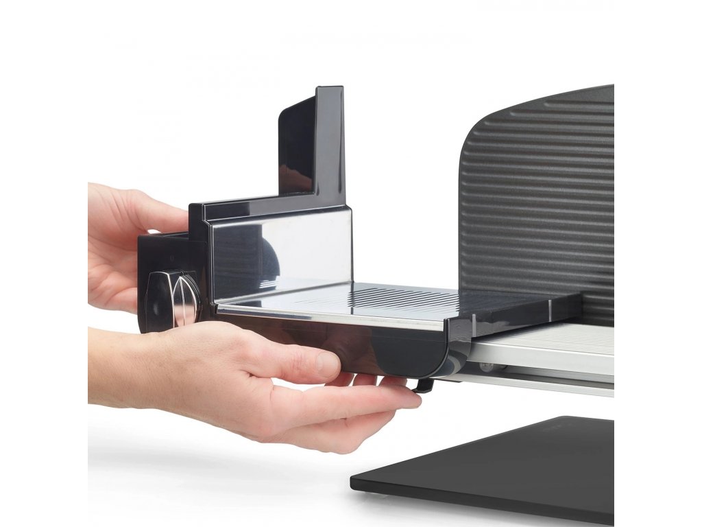 Kráječ je vybaven patentově chráněnými "GENIO" saněmi, jejichž výklopná deska lépe stabilizuje potravinu během krájení.