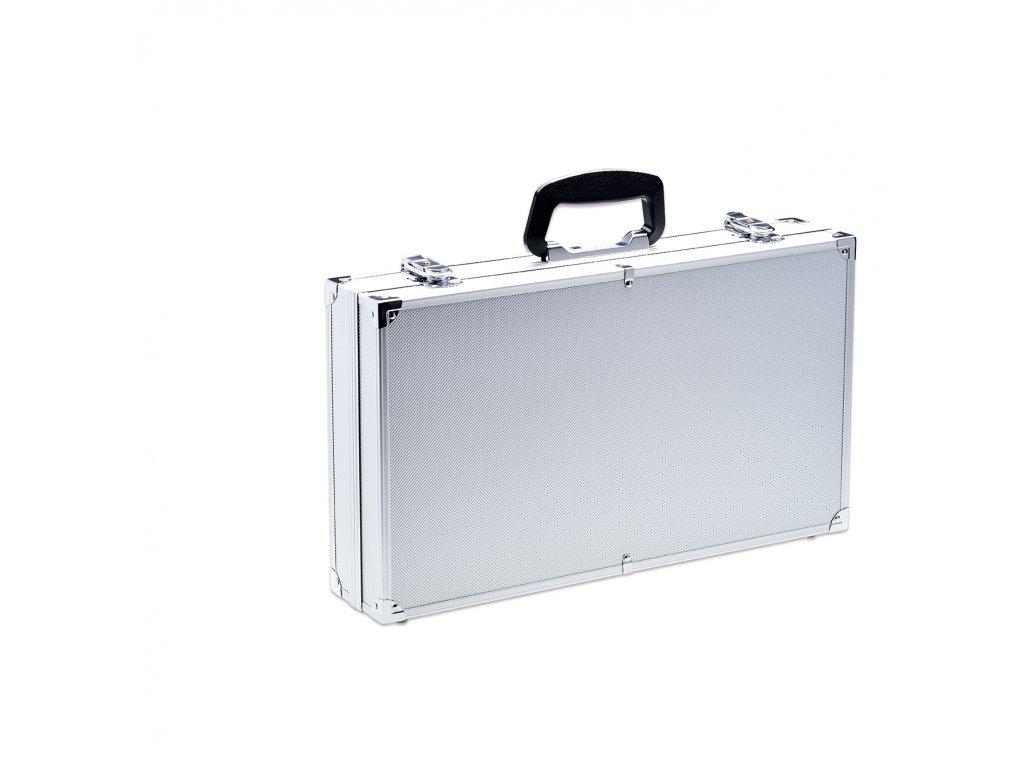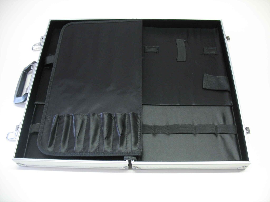 Pevný hliníkový kufr má na obou stranách magnetické plochy i pružná poutka pro bezpečné a spolehlivé zafixování jednotlivých nožů a dalších kuchařských pomůcek.