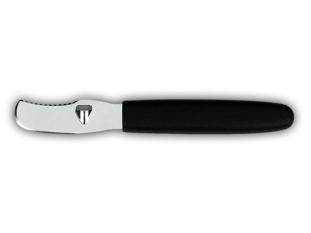 Nerezový loupací nůž s plastovou střenkou v černé barvě. Pomůcka je určena pro loupání pomerančů a dalších citrusových plodů.