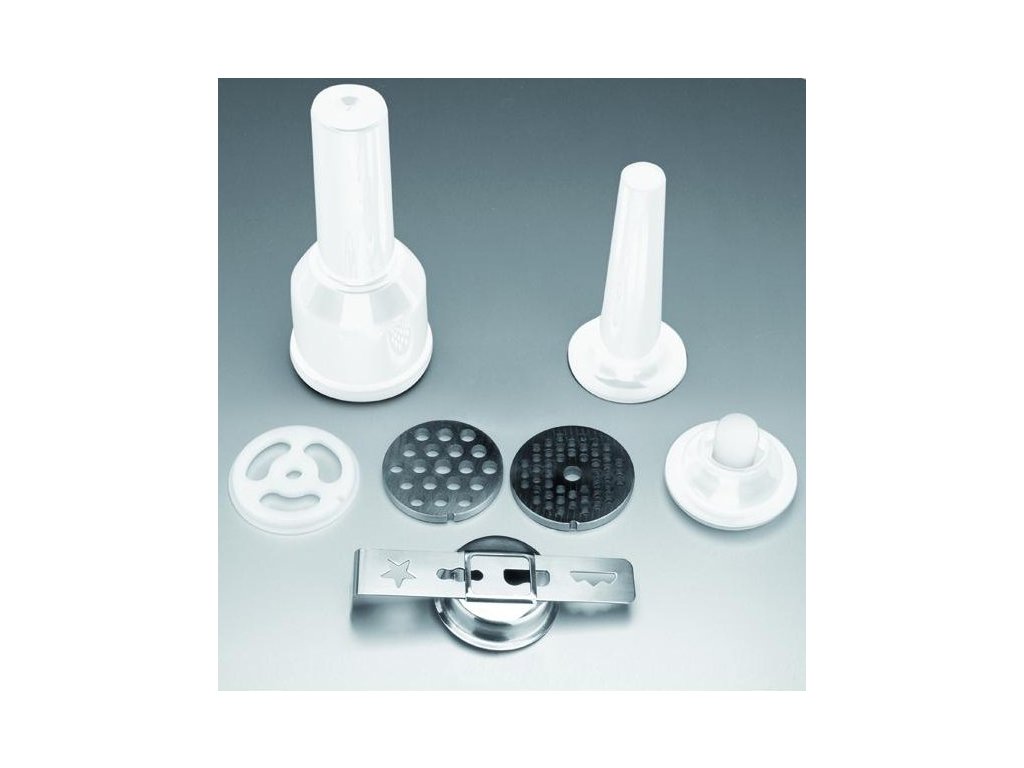 Příslušenství: 2 desky pro zpracování hrubého masa, plnička uzenin, kolík, plnící miska, nástavec pro vytlačované pečivo, nástavec pro kebbe (orientální kuchyně).