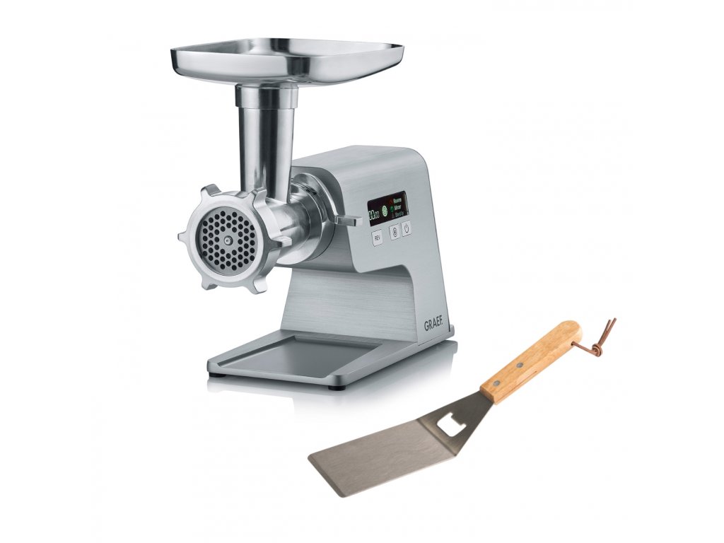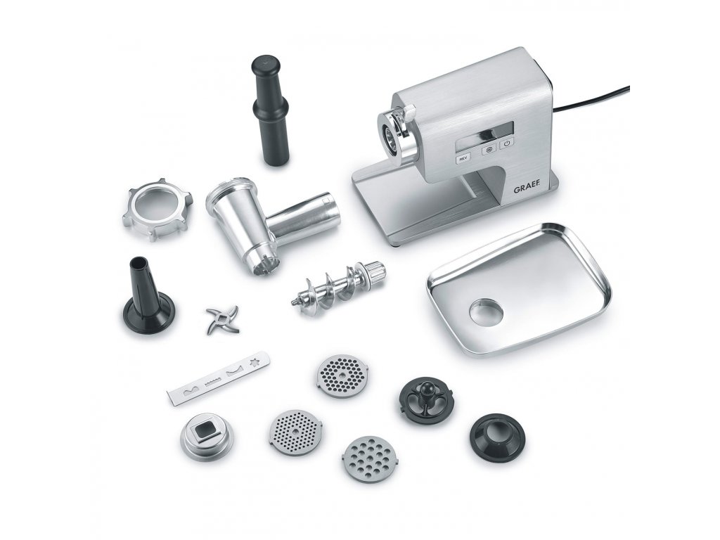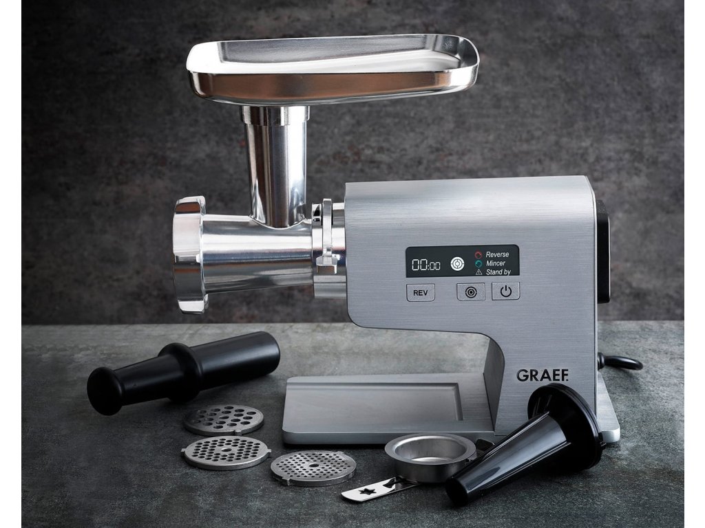 Mlýnek na maso GRAEF 500 ve stříbrné barvě s výkonem 400W. Jeho kvalitní, celokovové tělo je navrženo tak, aby bylo snadno demontovatelné a čistitelné. Má širokou škálu příslušenství včetně 3 desek (3 mm, 5 mm a 8 mm) a nože z nerezové oceli, plničku uzenin, nástavec pro kebbe a nástavce na vytlačované pečivo. Jeho výkonný 400W motor dosahuje až 2500W blokovacího výkonu a je vybaven digitálním funkčním displejem, který vám umožní přizpůsobit si mletí a dosáhnout tak lepších výsledků. Kromě toho je mlýnek vybaven ochranou proti přetížení a dvěma rychlostními stupni.