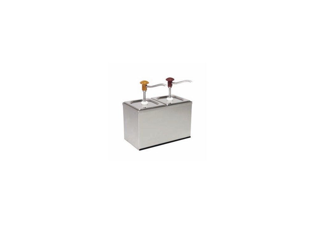 Dvojice ručních dávkovačů s nerezovými nádobami GN 1/6. Dávkovače jsou umístěny ve společném plášti.
