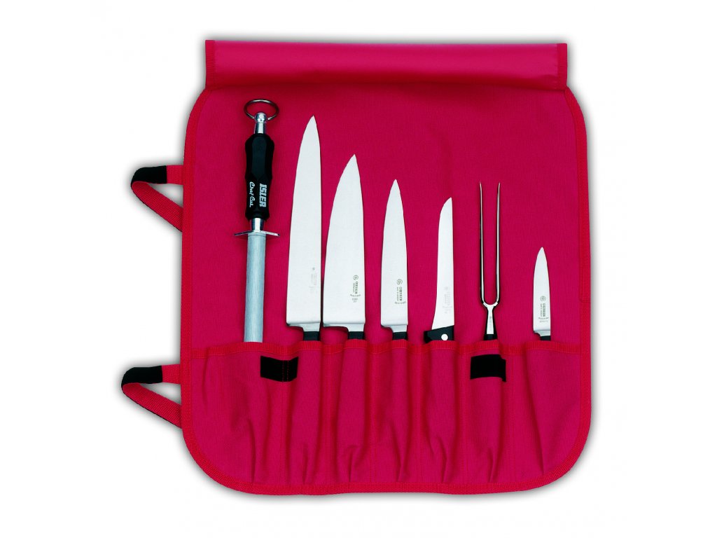 Sada obsahuje 5 nožů, vidličku, ocílku a pouzdro: kovaný kuchařský nůž 8280/20, kovaný kuchařský nůž 8270/25, kovaný filetovací nůž 8264/18, kovaný nůž na zeleninu 8240/10, vykošťovací nůž 3100P/13, kuchařská kovaná vidlička 9410P/18, ocílka s kulatým profilem 9922/25.