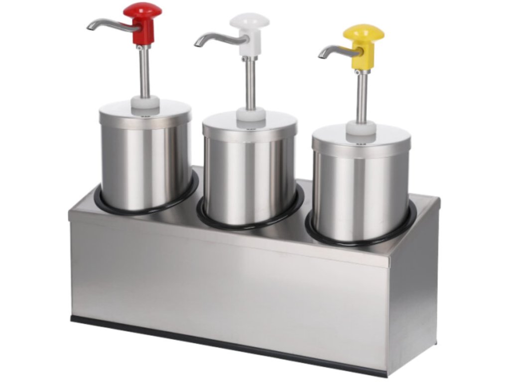 Sada tří ručních dávkovačů s nerezovým víkem a pláštěm. Dávkovače jsou umístěny ve společném nerezovém podstavci.