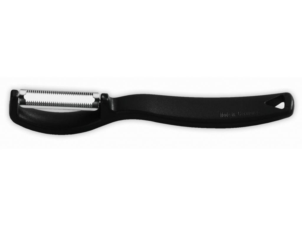 Nerezová škrabka s plastovou střenkou v černé barvě. Extrémně ostrá zoubkovaná čepel škrabky je oboustranná - se škrabkou mohou snadno pracovat praváci i leváci. Škrabka je určená především pro loupání rajčat, kiwi a podobně. Škrabkou lze s úspěchem loupat zeleninu a ovoce s tenkou slupkou, která se jinak obtížně loupe.