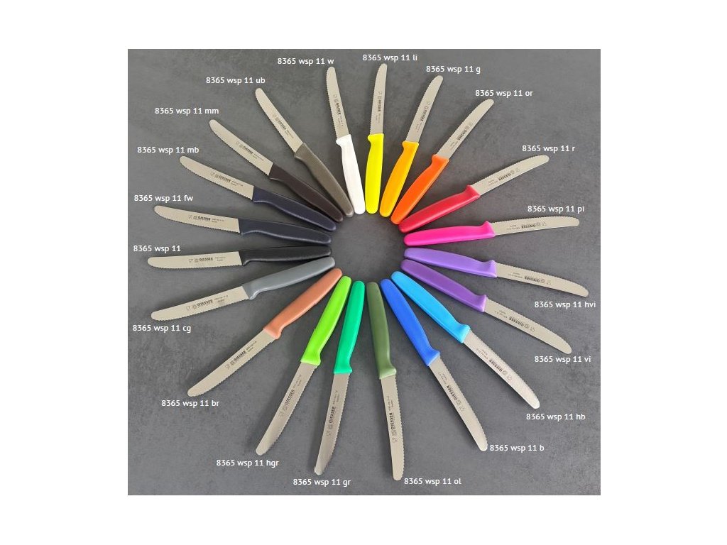 Nůž lze dodat také s barvou střenky: černá, žlutá, červená, modrá, bílá, zelená, světle modrá, světle zelená, limetková, oranžová, růžová, fialová, šedivá - nůž je na skladě ve všech barvách.