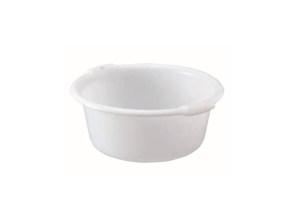 Kulatá nádoba vhodná pro styk s potravinami. Nádoba má bílou barvu.